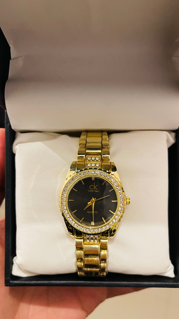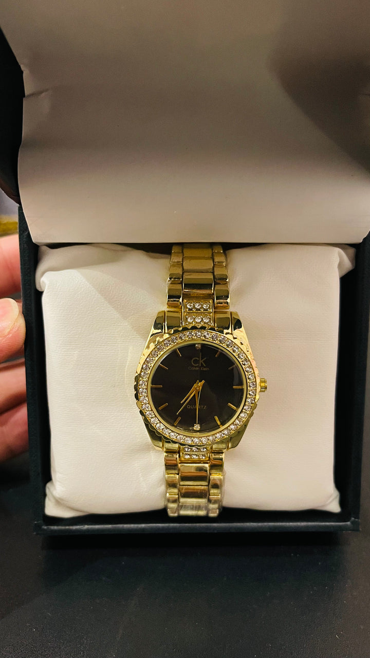 A classic gold-tone quartz watch featuring a striking black dial and a bezel fully encrusted with shimmering crystals. This elegant timepiece is perfect for everyday wear or dressing up any evening outfit.