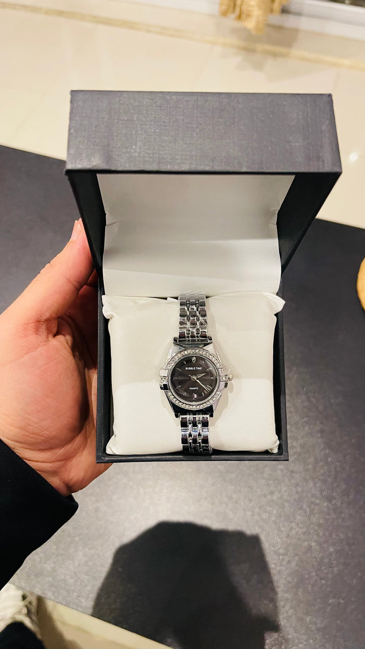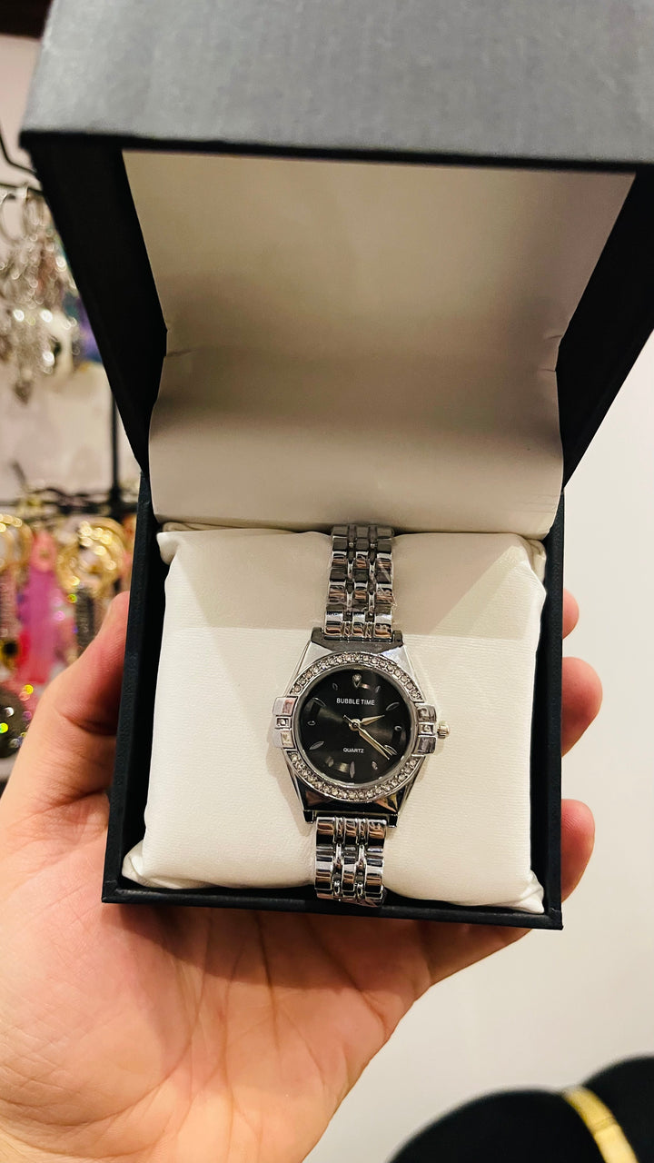 Shine every second with this stunning silver-tone wristwatch. Designed with a sleek metallic finish and a crystal-studded bezel, it blends timeless charm with a modern edge. Perfect for both casual elegance and evening glamour.