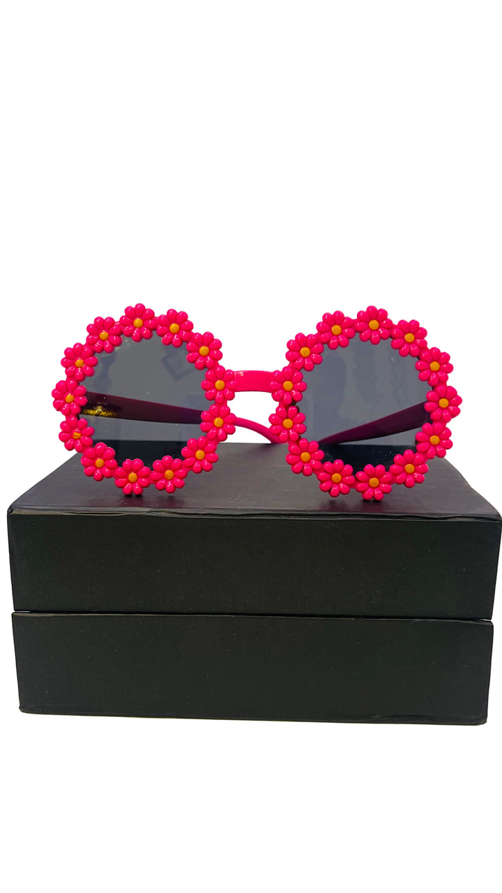 - Pink Daisy Round Sunglasses – Bright pink flower frames with dark lenses for a bold, fun look.