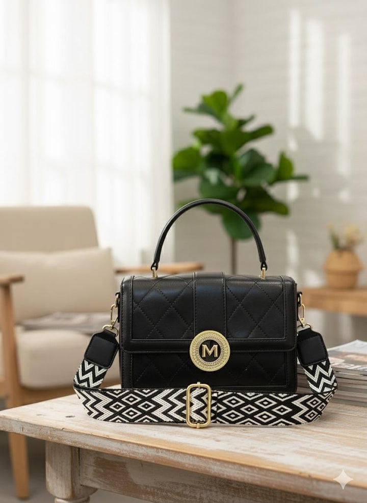 Elevate your everyday style with this elegant black quilted crossbody bag. Designed with premium craftsmanship, it features a structured silhouette, gold metallic “M” emblem, and a bold geometric strap for a chic statement. Perfect for both casual outings and classy evenings, this bag balances luxury and versatility.
